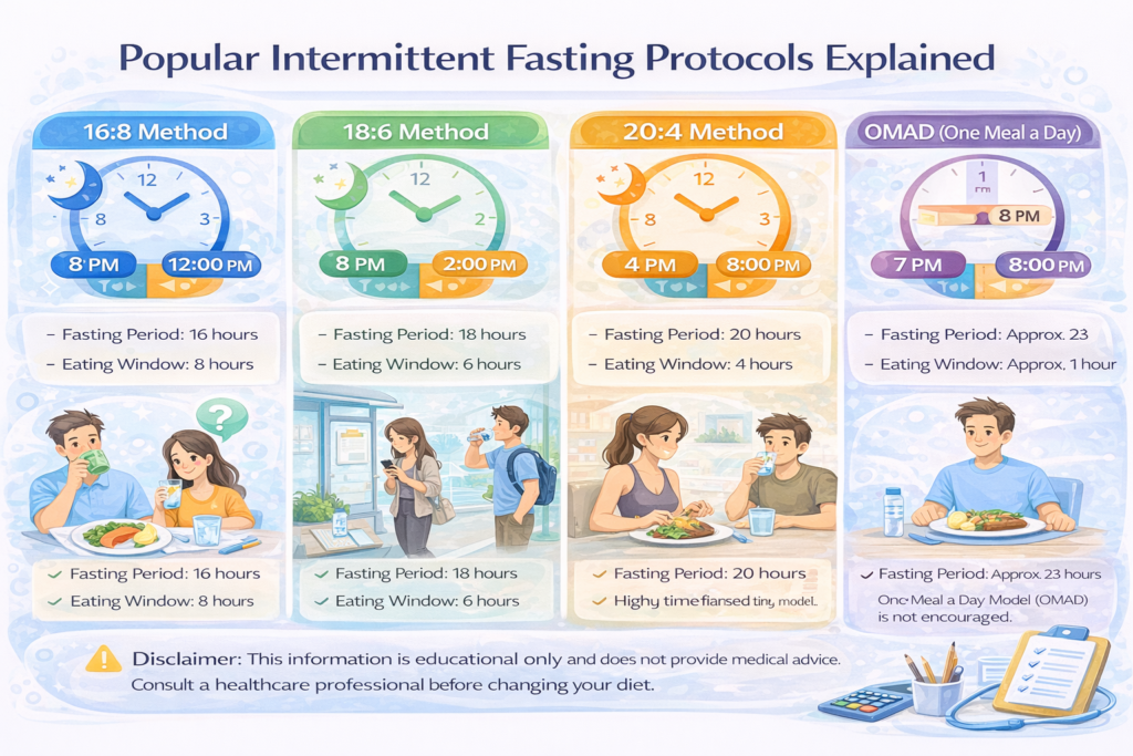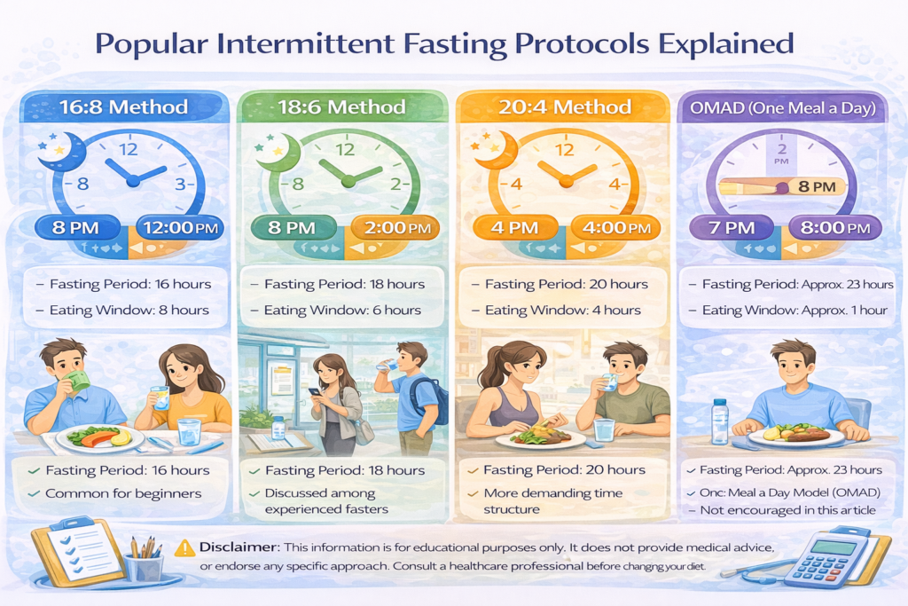 Intermittent fasting includes several time-based eating patterns that alternate between fasting and eating periods. These approaches are widely discussed in general wellness and lifestyle contexts. This article provides a neutral, educational overview of some of the most commonly known intermittent fasting protocols.